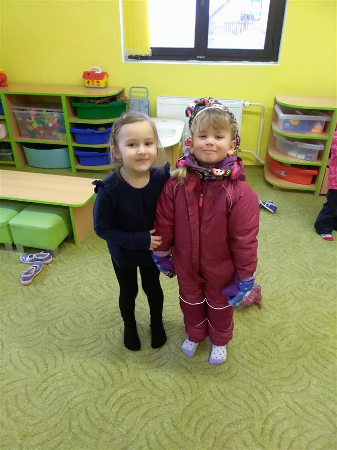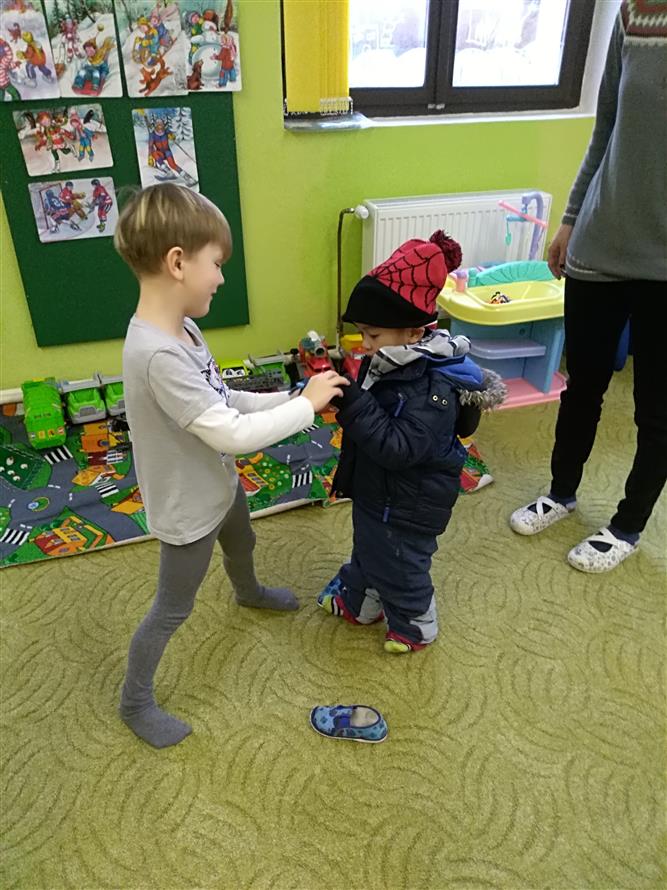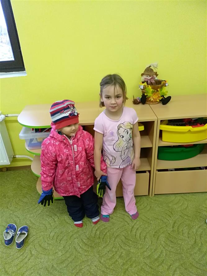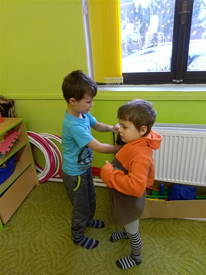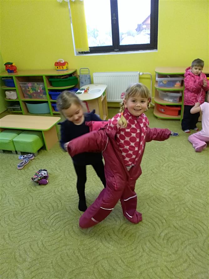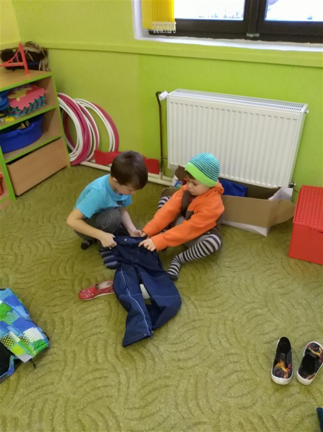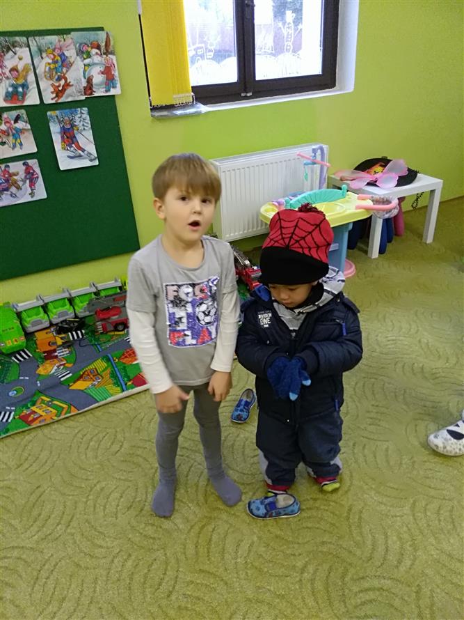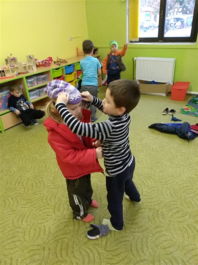Děti si vyzkoušely, jaké to je obléknout svého kamaráda. Každý starší měl na starosti mladšího. Děti museli obléknout vše, co patří k zimě. Byla to pro děti velká zábava.