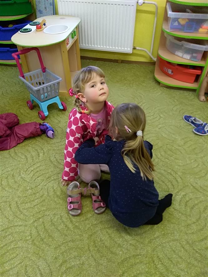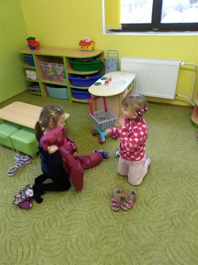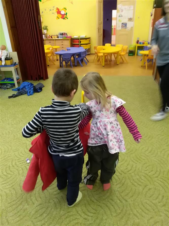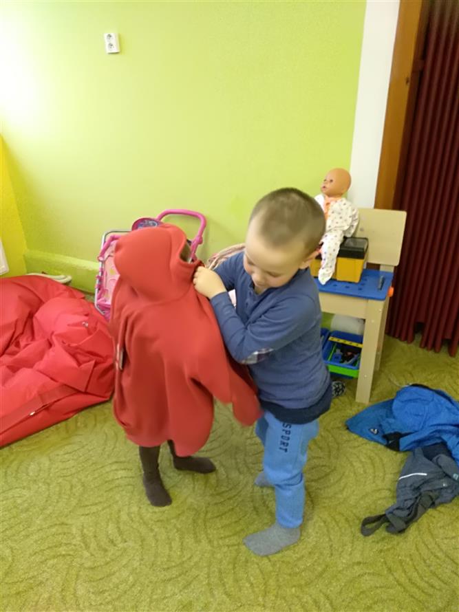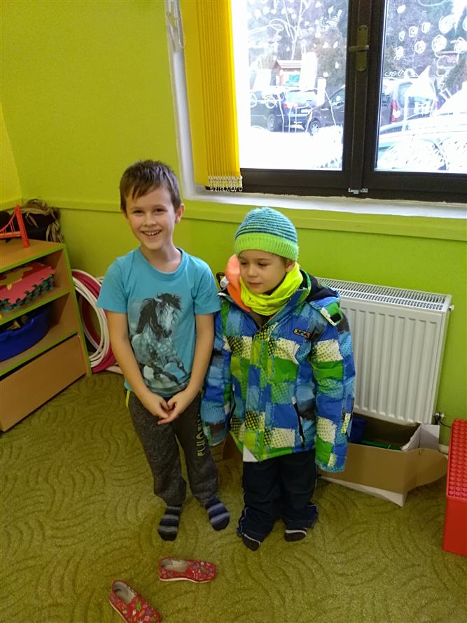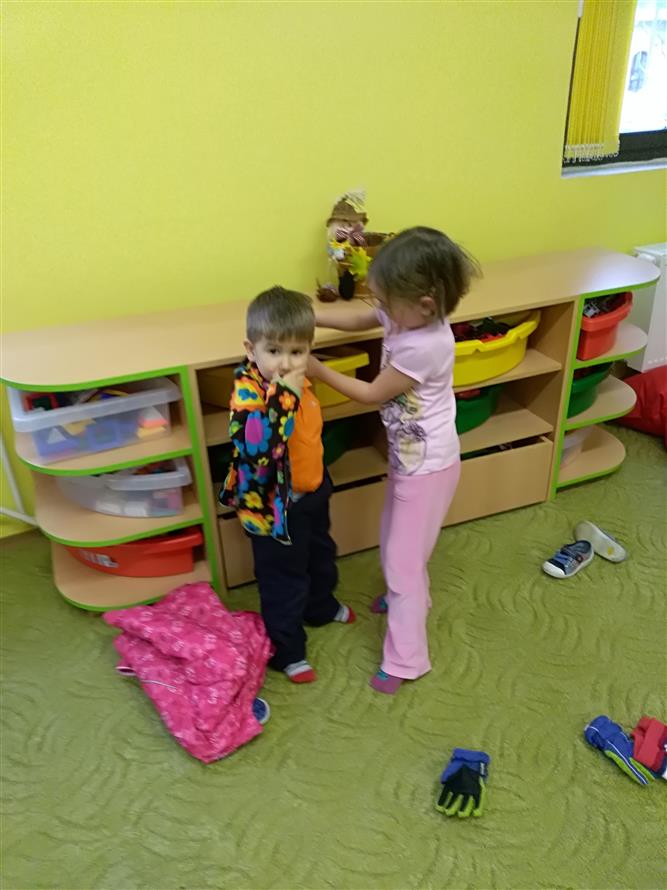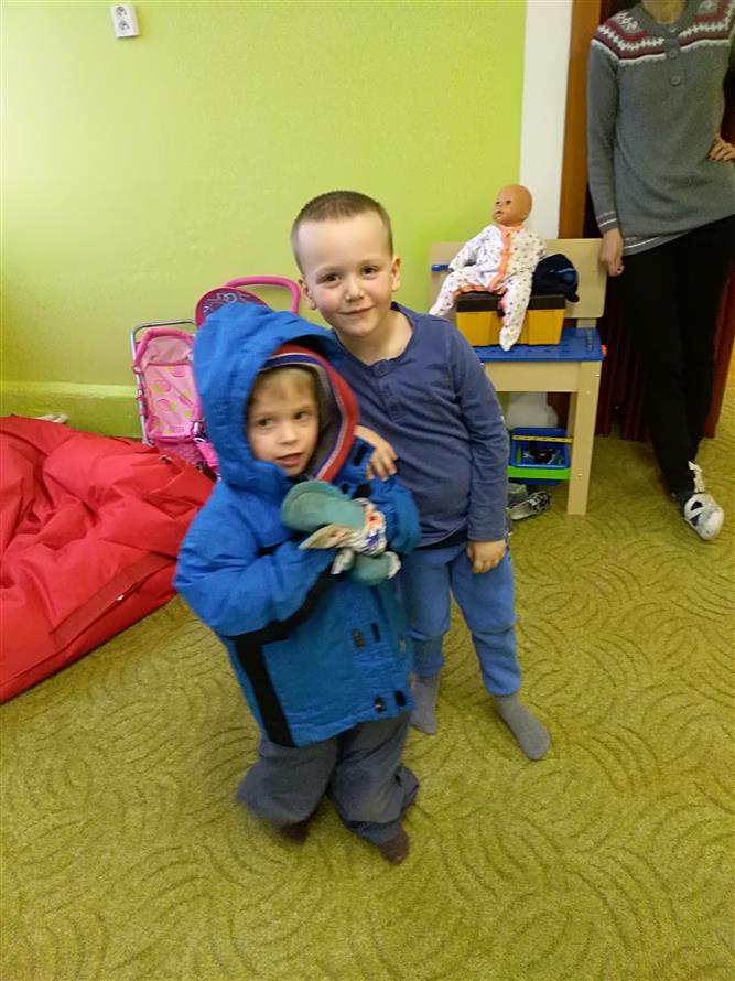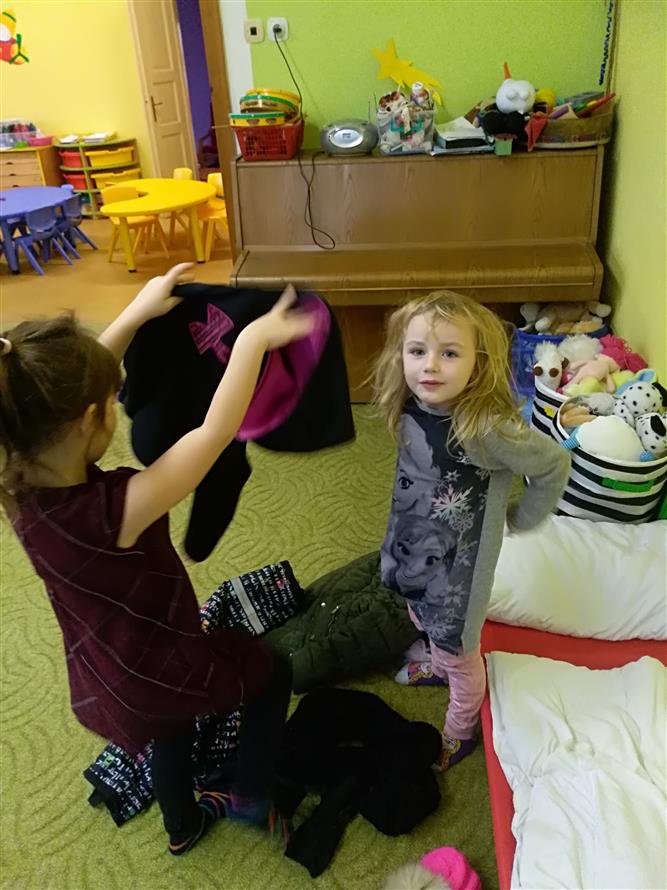 Děti si vyzkoušely, jaké to je obléknout svého kamaráda. Každý starší měl na starosti mladšího. Děti museli obléknout vše, co patří k zimě. Byla to pro děti velká zábava.