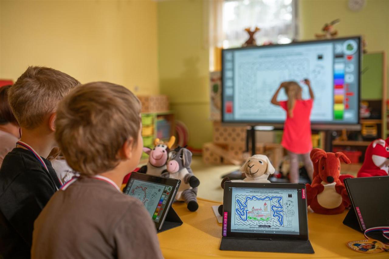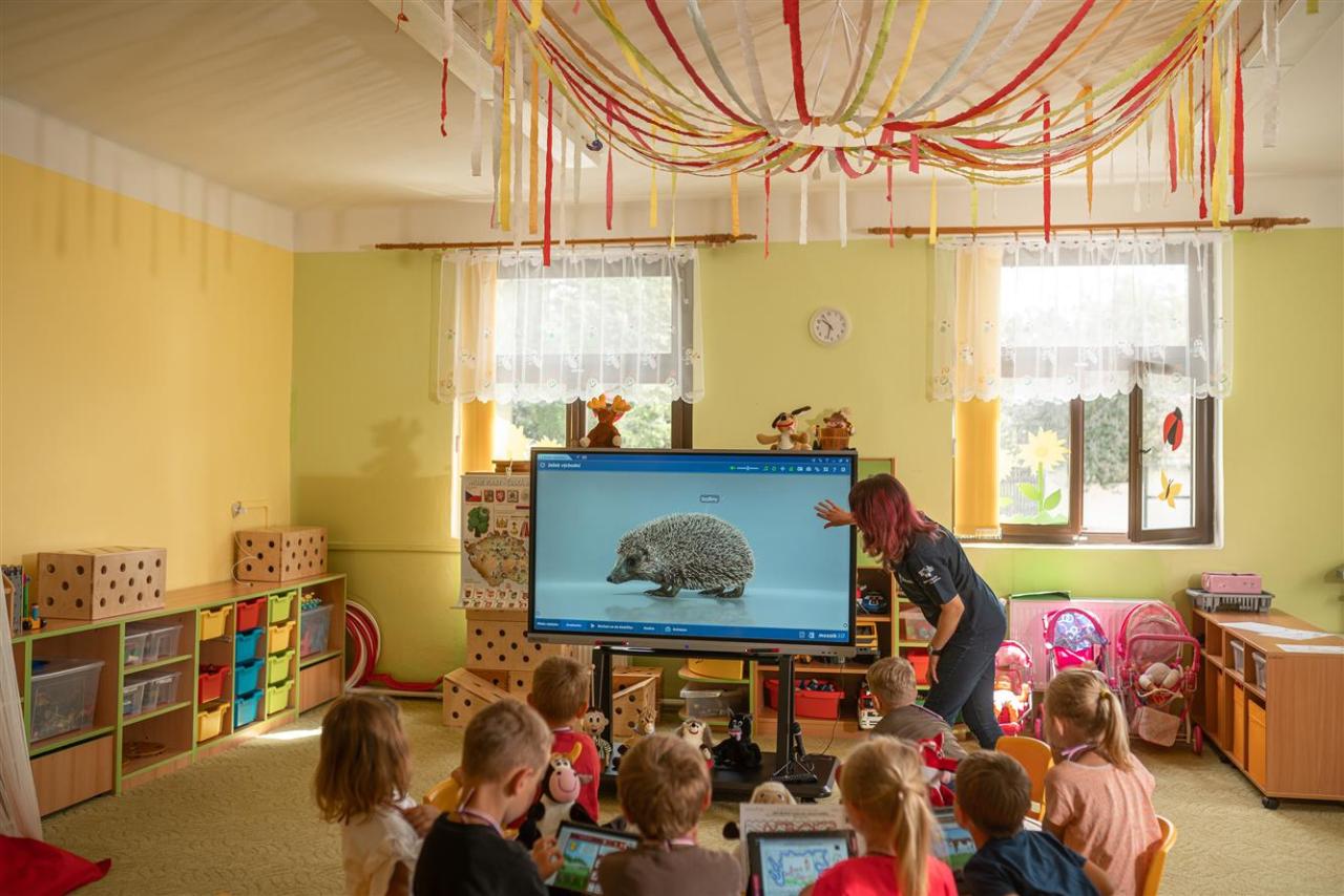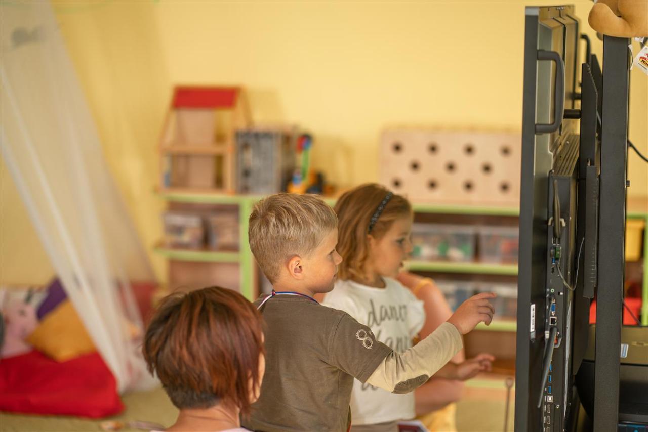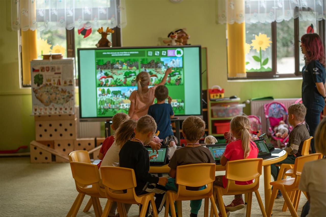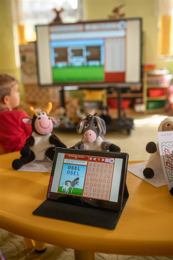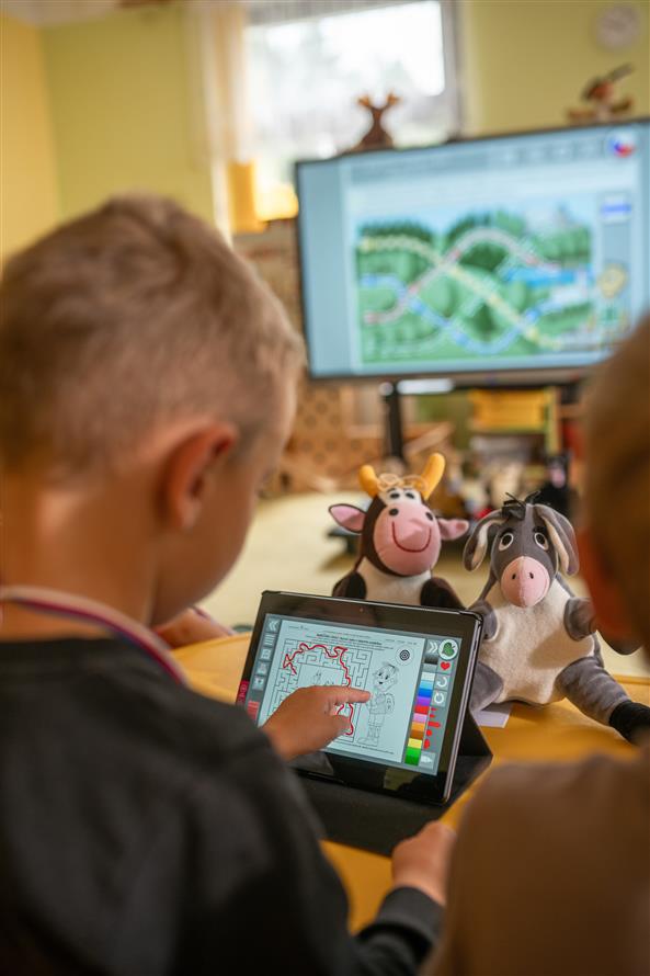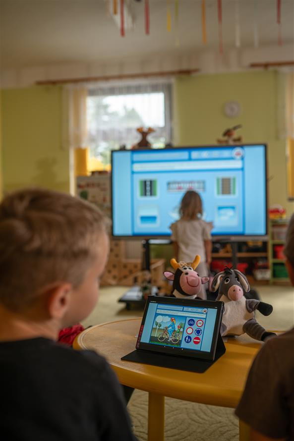 Protože jsme pracovali na nové interaktivní tabuli Multiboard, kterou jsme pořídili do MŠ. Děti si na ní procvičí zrakové a sluchové vnímání, pravolevou orientaci, procvičí si matematickou a čtenářskou pregramotnost a také si mohou na velké tabuli volně kreslit. Jejich výtvory můžeme i vytisknout a mohou sí je nechat na památku. Práce s tabulí je zanesena ve vzdělávacím programu MŠ jednou týdně a to v rámci digitálního vzdělávání.