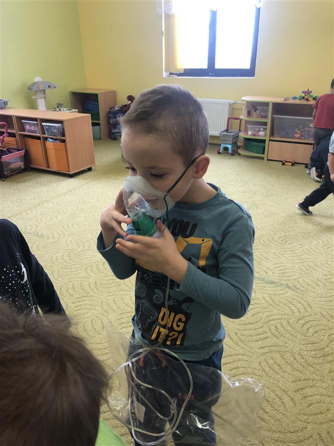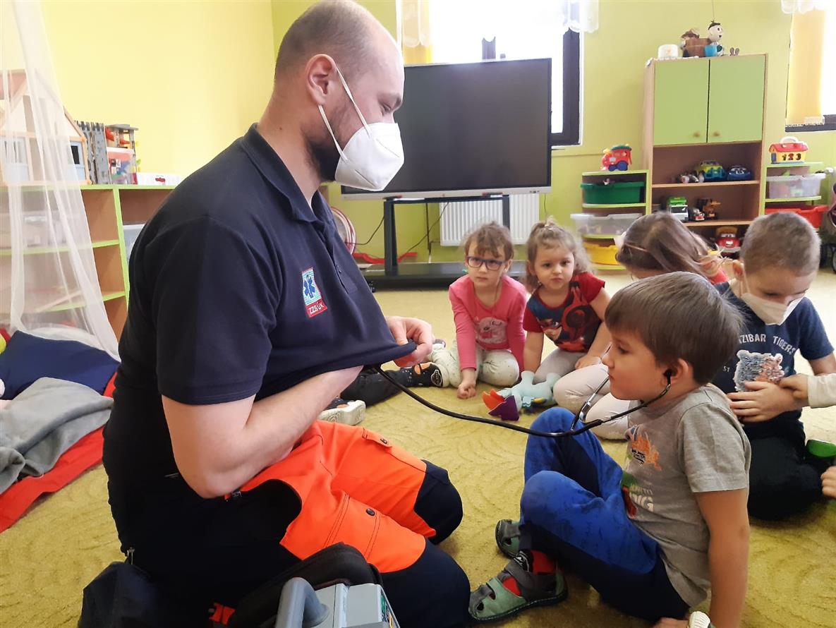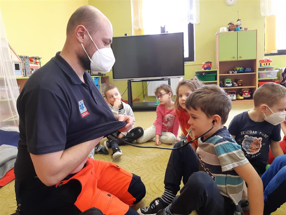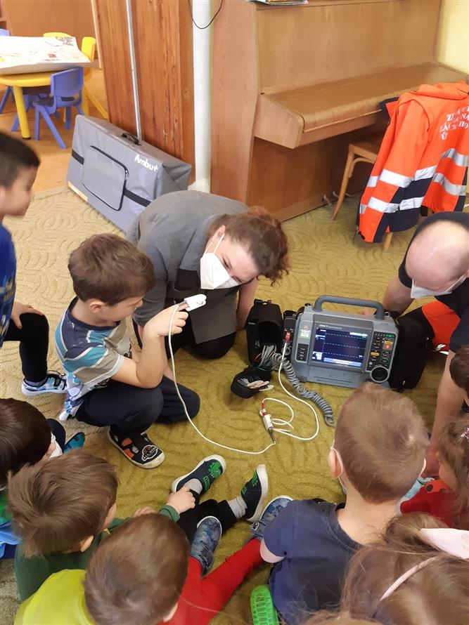 Vzhledem ke covid-19 situaci, jsme se zaměřili i na nemocniční léčbu a dodržování hygienických návyků. Představili jsme si i hasičskou činnost, vyslechli jsme si různé druhy zásahů, netradičních i tradičních. Při zdravotnické návštěvě jsme si poslechli srdíčko, a podívali se na křivku EKG, ukázali si oblek, ve kterém se smí do pokoje s covid pozitivním pacientem a také jsme si jako vždy zavázali ručky, nožky a co nás ještě napadlo. Proběhl nácvik situace, kdy potkáme zraněného člověka a vyzkoušeli jsme si první pomoc.