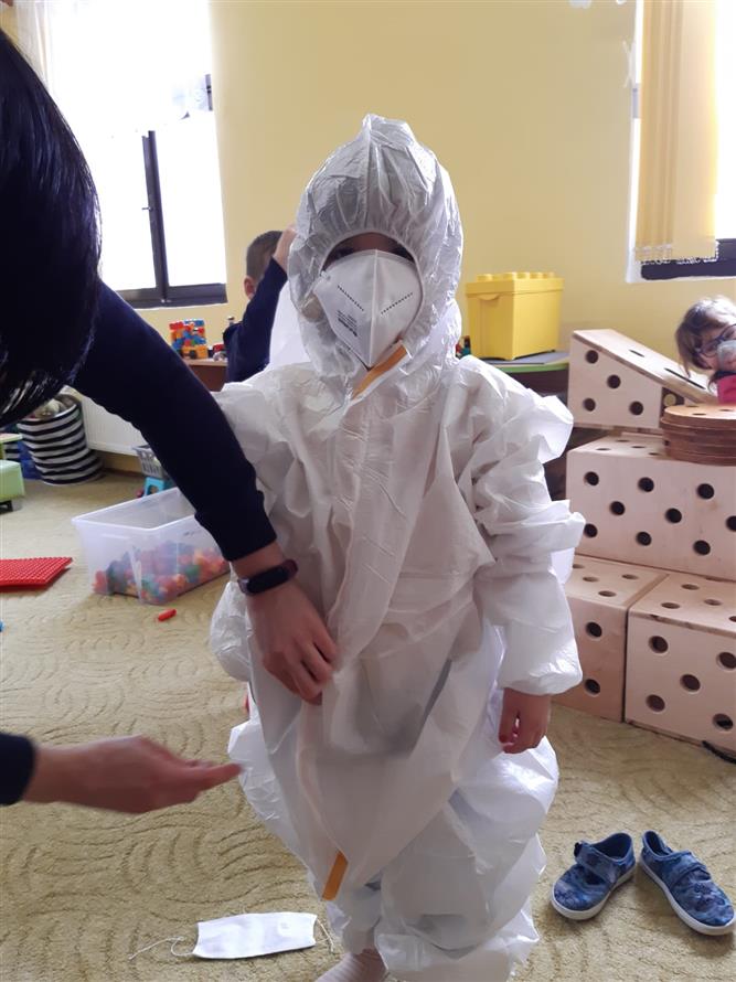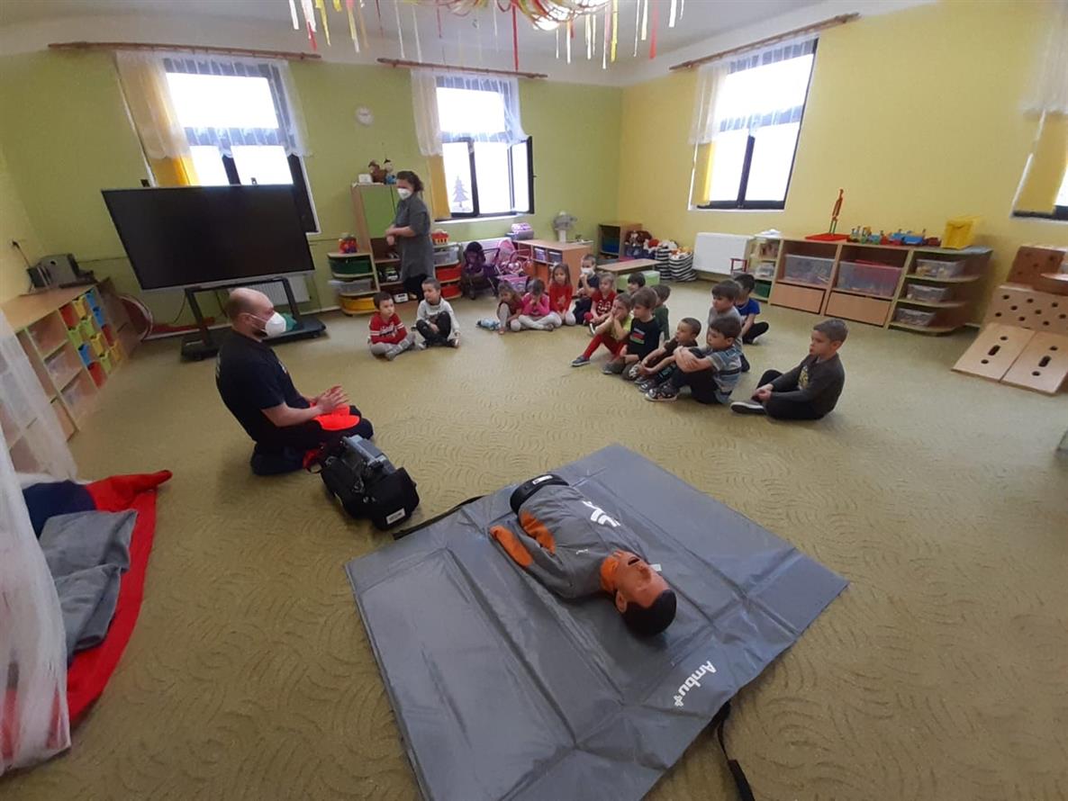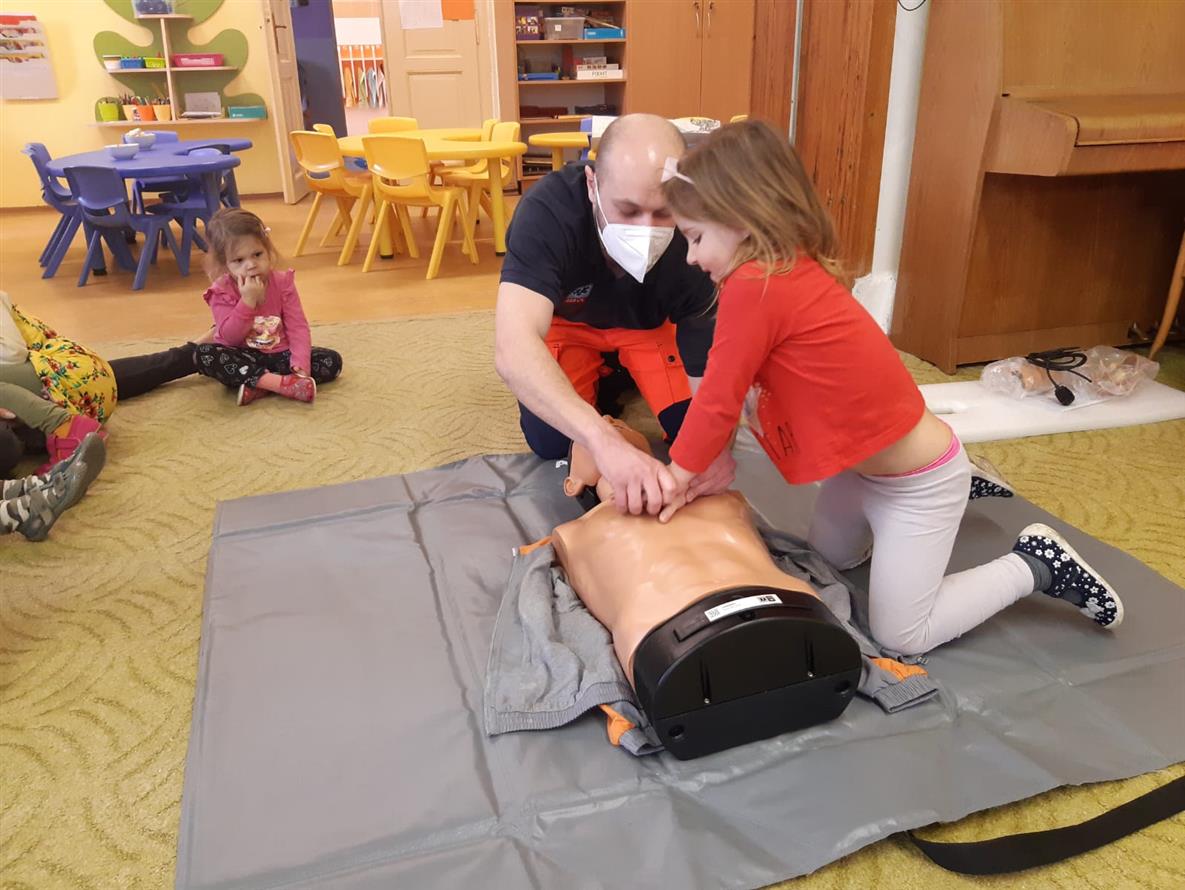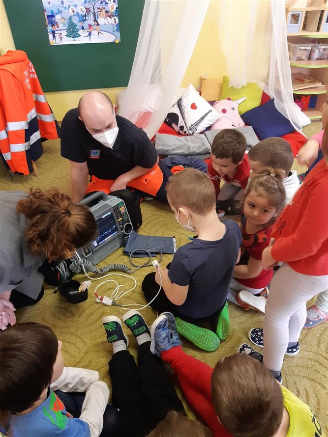 Vzhledem ke covid-19 situaci, jsme se zaměřili i na nemocniční léčbu a dodržování hygienických návyků. Představili jsme si i hasičskou činnost, vyslechli jsme si různé druhy zásahů, netradičních i tradičních. Při zdravotnické návštěvě jsme si poslechli srdíčko, a podívali se na křivku EKG, ukázali si oblek, ve kterém se smí do pokoje s covid pozitivním pacientem a také jsme si jako vždy zavázali ručky, nožky a co nás ještě napadlo. Proběhl nácvik situace, kdy potkáme zraněného člověka a vyzkoušeli jsme si první pomoc.