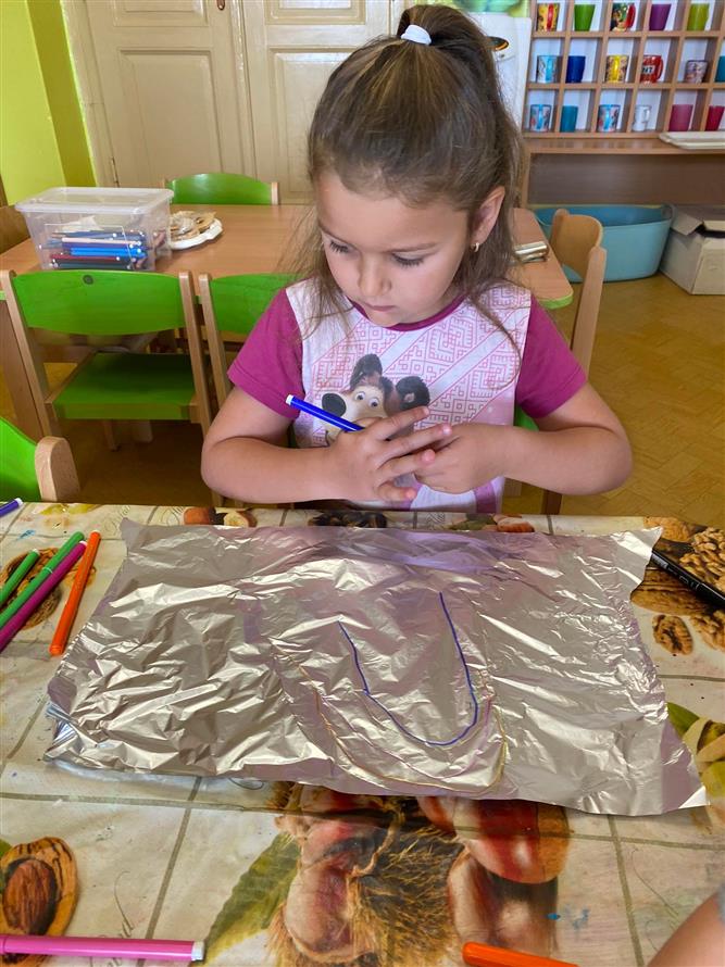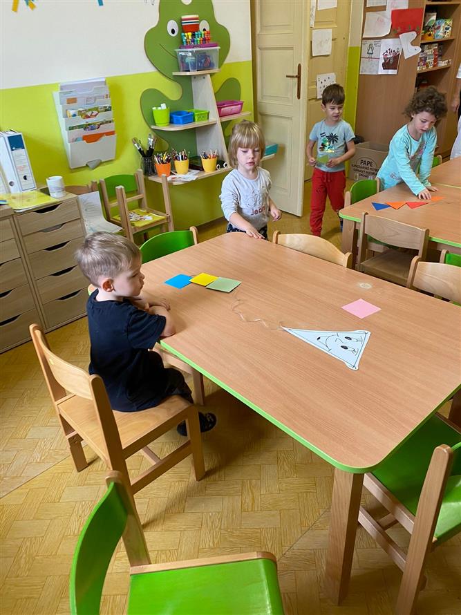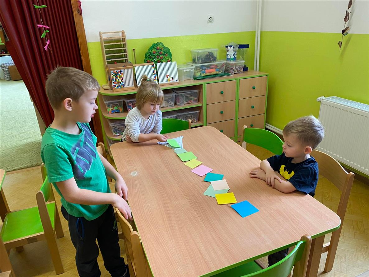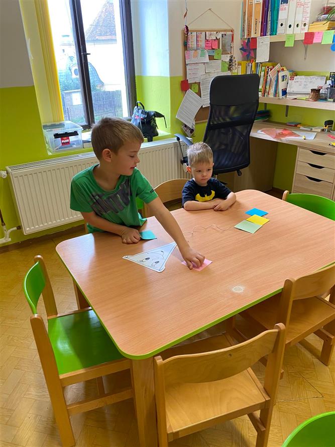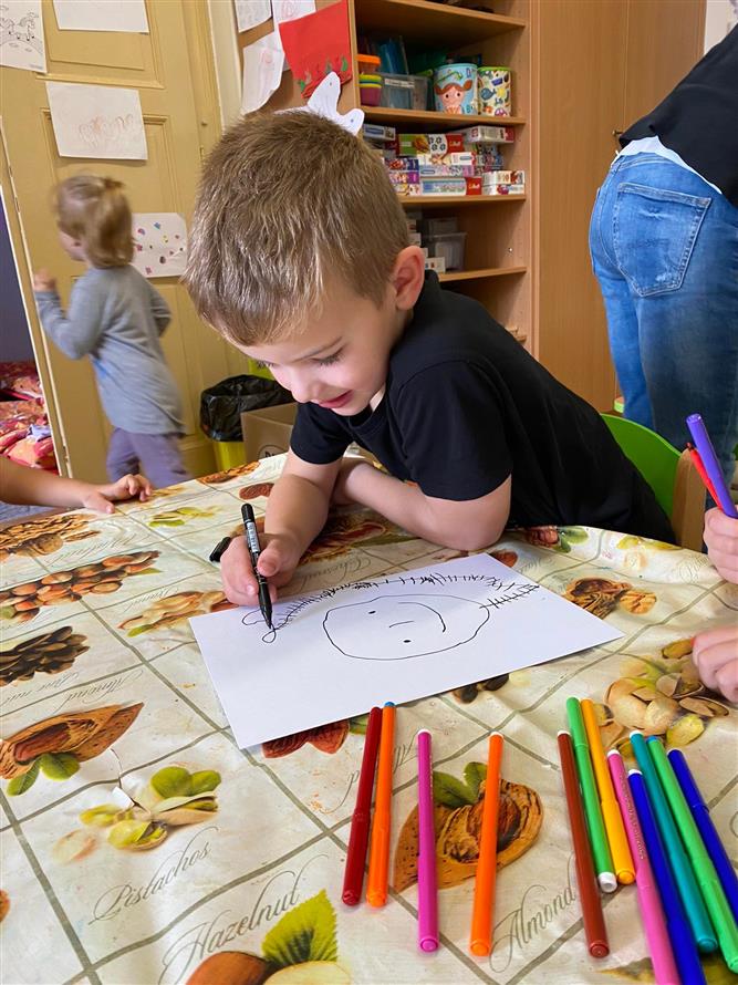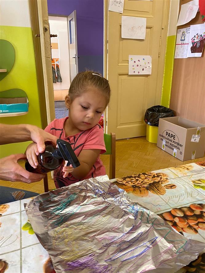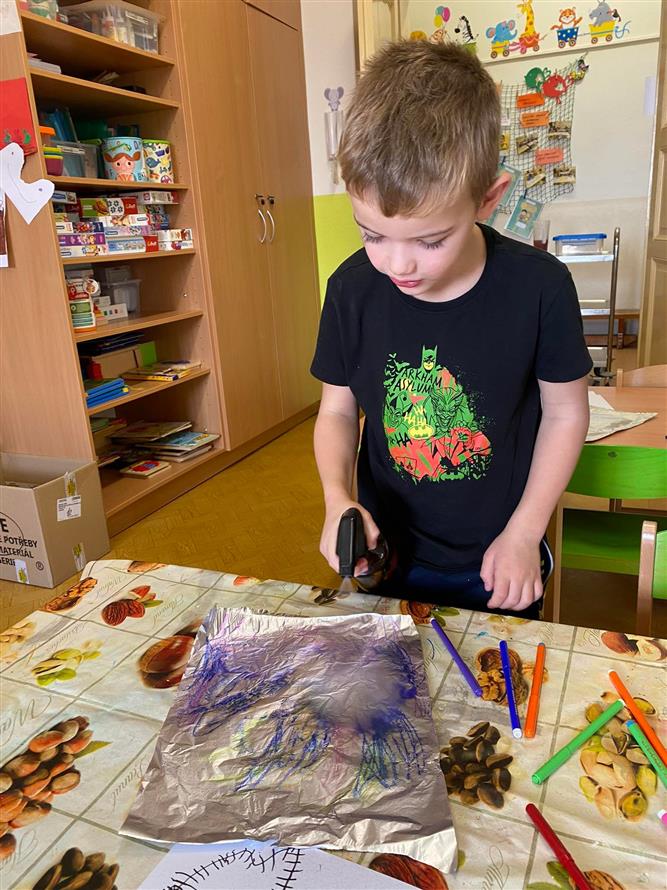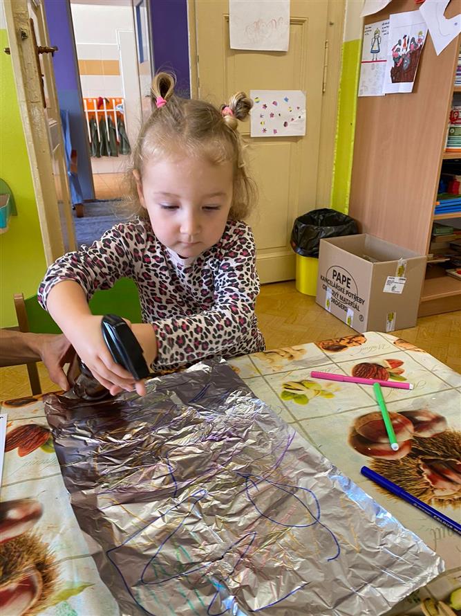 Vedeme děti k hygieně po práci, také k bezpečnosti s pomůckami při práci a v neposlední řadě také ke kreativitě a prostoru k vlastnímu projevu ( ne jen tomu mluvenému ). Proto má každý dostatek pomůcek, barev a nabídek k tomu, jakým způsobem se k dané činnosti postaví.